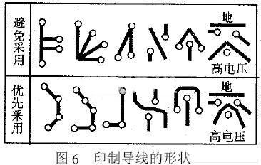 4.1 走線形狀不要有纏結(jié)和分支或硬拐角。因為那樣可能會破壞導線特性阻抗的一致性或?qū)е路瓷浜彤a(chǎn)生諧波或局部高電壓引起放電現(xiàn)象。一般優(yōu)先選用和避免采用的印制導線形狀,如圖6所示。