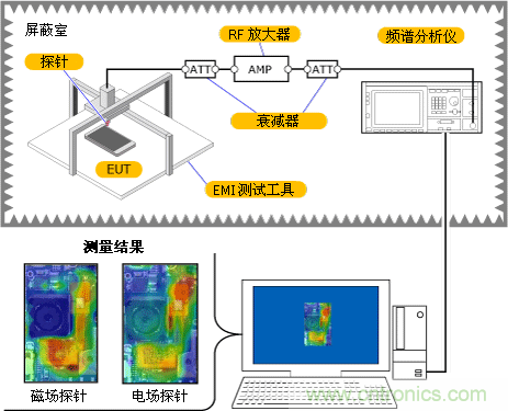 我們將EMI測(cè)試工具的電場(chǎng)探針和磁場(chǎng)探針通過(guò)RF放大器連接到頻譜分析儀,并對(duì)相鄰電磁場(chǎng)的分布進(jìn)行了分析。