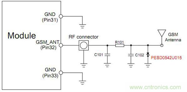 此模塊USB經(jīng)常用來配置數(shù)據(jù),插拔容易被靜電損壞,本方案可以采用分立器件或者集成器件,但要確保選擇的器件結(jié)電容小于3PF。