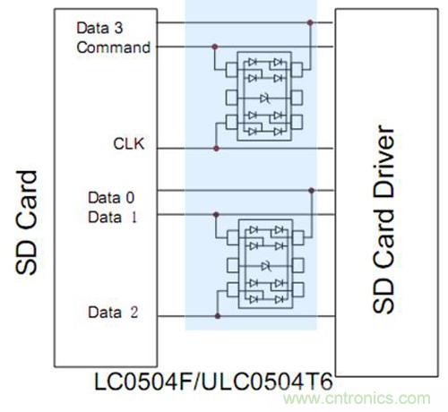 SD卡重點(diǎn)保護(hù)data數(shù)據(jù)線和CLK,要確保選擇的ESD器件是低容值和小封裝的產(chǎn)品:LC0504F SOT-563