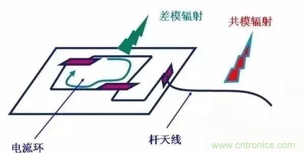 這個圖可能有些抽象,不過正好EMC是很難做到具體,需要給到我們一些啟示,可知:差模輻射是以環(huán)路的形式存在,而共模輻射是以天線的形式發(fā)射;因此正好印證前面說我們布板的時候開關(guān)環(huán)路的布局以及走線的時候不要走銳角,常規(guī)走45度,最好是圓弧走線,當(dāng)然走線效率會比較低;