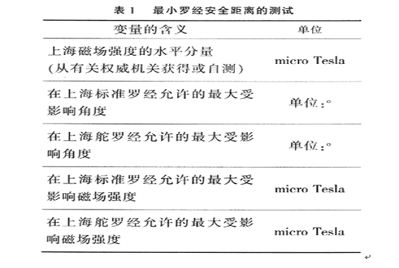 羅經(jīng)最小安全距離的測試方法是利用地球磁場強度與角度的關(guān)系,將對角度的測量轉(zhuǎn)化為對磁場強度的測最。在上海地區(qū)的測試方法如表1所示。