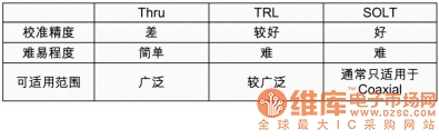 在三種常用的測試儀器中,網(wǎng)絡(luò)分析儀的校準方法最為嚴謹,頻譜分析儀次之,示波器的校準方法最為簡單。因此,我們這里主要討論網(wǎng)絡(luò)分析儀的校準方法。網(wǎng)絡(luò)分析儀常用的校準方法有三種,thru、trl和solt。三種方法的特性如表1所示。