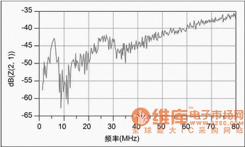 測試電源系統(tǒng)性能時,通常使用網(wǎng)絡(luò)分析儀,測試對象是電源系統(tǒng)的self-impedance和transfer-impedance。一般情況下,電源系統(tǒng)的阻抗均遠小于網(wǎng)絡(luò)分析儀系統(tǒng)阻抗(50歐姆),所以測試時只要做直通校準就可以了,利用公式s21=z/25就可以得到電源系統(tǒng)的阻抗。圖2所示為某單板電源阻抗特性。