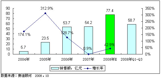 圖2 2004-2008年中國數(shù)字電視機(jī)頂盒市場銷售額及預(yù)測