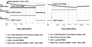 圖3顯示了采用2個以1A電流驅動的LED閃光燈和1個以2A電流驅動的LED閃光燈的測試結果。正如所見到的一樣,超級電容可以很容易地提供閃光持續(xù)120ms所需的電流,同時保持電源電壓充分地高于LED的VF電壓。在兩次閃光之間,超級電容以一個較慢的速率再充電,充電時間在外部設定,可針對不同的電池尺寸和化學原理進行優(yōu)化。圖4顯示了閃光功能和電影模式選項的數字控制。