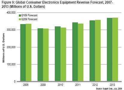 圖9所示為iSuppli對2008年至2013年期間全球消費電子設(shè)備營收的預(yù)測。
