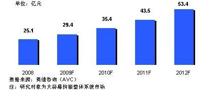 屏幕拼接市場已經(jīng)進入快速成長期,據(jù)奧維咨詢(AVC)《中國大屏幕拼接市場研究報告》顯示,2008年中國市場規(guī)模約為25.1億元,2009年雖然遭遇經(jīng)濟大環(huán)境的影響,預(yù)計仍將增長17%左右,市場規(guī)模將達29.4億元。市場的成長主要得益于國家對能源、交通等基礎(chǔ)建設(shè)的大規(guī)模投入,以及09年全運會、10年世博會、亞運會等大型賽會事的拉動。