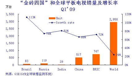 - 2009年1季度,金磚四國平板電視銷量為747萬臺,占同期全球市場的25%