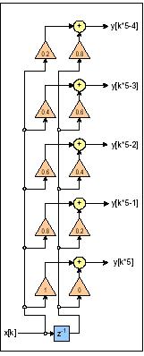 通過(guò)使用過(guò)采樣排列的數(shù)字濾波器,也可以實(shí)現(xiàn)這種卷積。圖中所示的排列是一個(gè)5點(diǎn)過(guò)采樣器。在這一排列中,每個(gè)新樣點(diǎn)都生成5個(gè)新樣點(diǎn)。濾波器輸出僅與新輸入和最后一個(gè)輸入有關(guān)。濾波系數(shù)通過(guò)對(duì)窗口采樣生成。
