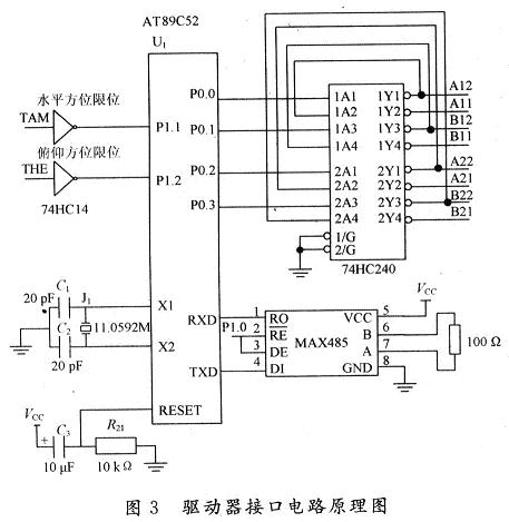跟蹤系統(tǒng)中微處理器選用89系列性?xún)r(jià)比高和功耗低的89C52。74HC14芯片是6非門(mén)施密特觸發(fā)器,與P1.1和P1.2口相連,控制方位限位信號(hào)。74HC240芯片,八反相三態(tài)緩沖器/線驅(qū)動(dòng)器,用于數(shù)據(jù)緩沖及總線驅(qū)動(dòng)。系統(tǒng)使用兩片74HC240芯片,通過(guò)P0口引腳控制,兩片74HC240的16個(gè)輸出引腳作為步進(jìn)電機(jī)驅(qū)動(dòng)電路的輸入控制信號(hào),分別控制步進(jìn)電機(jī)俯仰方向和水平方位的正反轉(zhuǎn)。系統(tǒng)與上位機(jī)的通信選用MAX485接口芯片,由P1.0口控制其收發(fā)狀態(tài)。驅(qū)動(dòng)器接口電路如圖3所示。