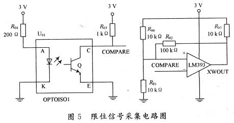 采用光電耦合器與電壓比較器電路組成的微機(jī)步進(jìn)電機(jī)限位電路,其電路圖如圖5所示。