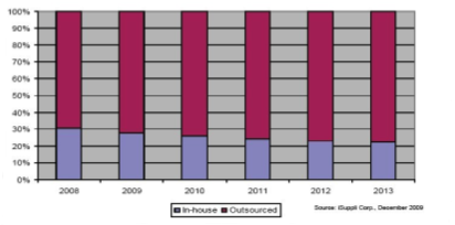 iSuppli公司對于內(nèi)部及外部制造的機頂盒營業(yè)收入百分比情況的預測。