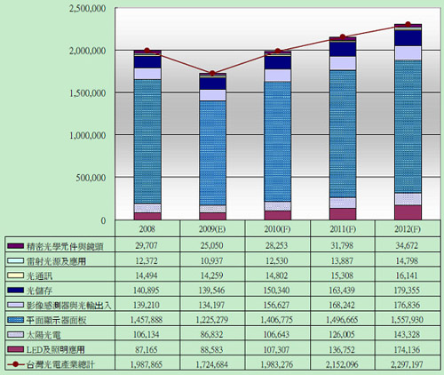 所幸景氣在2009年第一季跌到谷底之后便開始逐步回升,至第四季才確定恢復(fù)熱絡(luò)的景象。但是臺(tái)灣地區(qū)光電產(chǎn)業(yè)還是難抵金融風(fēng)暴的余威,整體產(chǎn)值下滑了13%,到1兆7,247億新臺(tái)幣。如原本所預(yù)估的,金融風(fēng)暴會(huì)犧牲掉兩年的成長(zhǎng)率;保守預(yù)期臺(tái)灣地區(qū)光電產(chǎn)業(yè)將于2010年重拾成長(zhǎng),再度站回接近2兆新臺(tái)幣之規(guī)模。