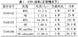 TexasInstruments還提供具有數(shù)字增益控制功能的RMS功率測量方式,使THD+N≤10%。利用TI公司的TAS5508或TAS5086型調(diào)制器,可以實現(xiàn)數(shù)字增益。THD+N為10%時的平均功率要高于正常FTC的THD+N<1%時的額定功率。表2列出了THD+N為10%時的平均功率。