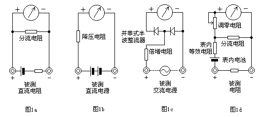 如圖1d所示,在表頭上并聯(lián)和串聯(lián)適當?shù)碾娮?,同時串接一節(jié)電池,使電流通過被測電阻,根據(jù)電流的大小,就可測量出電阻值。改變分流電阻的阻值,就能改變電阻的量程。