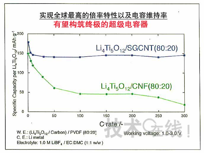 東京農(nóng)工大學(xué)研究生院于2009年3月宣布,開發(fā)出了采用碳納米纖維(CNF)與LTO復(fù)合而成的負極的鋰離子電容器,與以往的采用活性炭的雙電層電容器相比,實現(xiàn)了約3倍的能量密度。而且還表示,將完善由日本Chemi-Con定于2011年春季樣品供貨采用該技術(shù)的鋰離子電容器的體制。