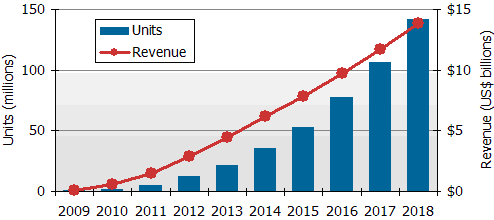 - 預(yù)估到2018年將大幅成長到1億4千200萬臺,年產(chǎn)值達(dá)139億美元