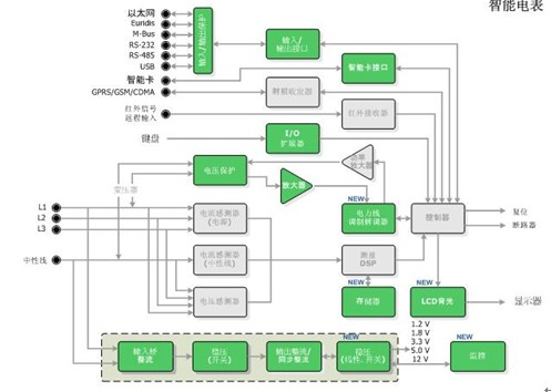 安森美半導(dǎo)體應(yīng)用于智能電表的方案包含一系列標(biāo)準(zhǔn)產(chǎn)品、專用標(biāo)準(zhǔn)產(chǎn)品(ASSP)及專用集成電路(ASIC),可以提供智能電表的4種基本功能,包括:電源/電源管理、計量、寄存及通信。圖2是由安森美半導(dǎo)體的多種器件(圖中綠色部分)構(gòu)成的智能電表應(yīng)用。