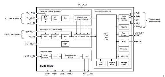 AMIS-49587符合IEC1334標(biāo)準(zhǔn),有助于簡化設(shè)計、降低開發(fā)及應(yīng)用成本,并加速上市進(jìn)程。該器件基于ARM7TDMI處理器內(nèi)核,包含物理接口收發(fā)器(PHY)和媒體訪問控制器(MAC)層,而大多數(shù)競爭方案都需要復(fù)雜的嵌入式軟件來執(zhí)行與AMIS-49587相同的功能。該器件采用擴(kuò)頻型移頻鍵控(S-FSK)調(diào)制技術(shù),結(jié)合精確的濾波,為長距離電力線提供可靠的低數(shù)據(jù)率通信,以及2,400 bps(波特)的半雙工可調(diào)節(jié)通信速率。不到20千赫(kHz)的低工作頻率配以自動中繼器(repeater)功能,令通信更可靠,通信誤差比其他及現(xiàn)有方案更低。圖3是AMIS-49587的方框圖。