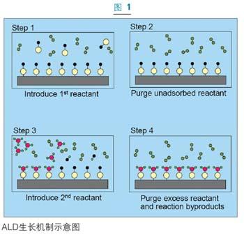 ALD的基本步驟如圖一所示。這種淀積過程是在經(jīng)過活性表面處理的襯底上進行的。首先將第一種反應(yīng)物引入反應(yīng)室使之發(fā)生化學(xué)吸附,直至襯底表面達到飽和。過剩的反應(yīng)物則被從系統(tǒng)中抽出清除,然后將第二種反應(yīng)物放入反應(yīng)室,使之和襯底上被吸附的物質(zhì)發(fā)生反應(yīng)。剩余的反應(yīng)物和反應(yīng)副產(chǎn)品將再次通過泵抽或惰性氣體清除的方法清除干凈。這樣就可得到目標化合物的單層飽和表面。這種ALD的循環(huán)可實現(xiàn)一層接一層的生長從而可以實現(xiàn)對淀積厚度的精確控制。