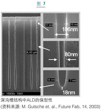 最近,Al2O3/HfO2以及Al2O3/ZrO2結(jié)構(gòu)也引起了人們的關(guān)注。PEALD也已經(jīng)用于eDRAM中。電容滿足所有的要求,即等效氧化層厚度要小于8埃,125攝氏度時漏電流要小于1fA/cell,工作電壓為1伏時壽命要大于十年。圖7為典型的ALD薄膜在深槽結(jié)構(gòu)的保角性和動態(tài)存儲器生產(chǎn)中的半球形硅晶結(jié)構(gòu),金屬ALD薄膜,例如氮化鈦(TiN)也廣泛應(yīng)用于動態(tài)存儲器制造中的電容電極。