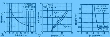 LM1876的負載范圍很寬,在4~30Ω的范圍內(nèi)均能穩(wěn)定地工作,其輸出功率與負載的對應(yīng)關(guān)系如圖5所示。LM1876的供電電壓范圍為±10~±25V,當供電電壓降低時,影響的只是輸出功率的大小,而對其他指標影響不大,供電電壓與輸出功率的對應(yīng)關(guān)系如圖6所示。LM1876的6、11腳為左/右聲道靜噪控制端,當這幾腳接高電平(高于1.6V)時,LM1876內(nèi)部電路執(zhí)行靜音操作,切斷輸出端的音頻信號(如圖7所示)。因此可以在這些引腳中與正電壓之間接一個RC延時網(wǎng)絡(luò),使其在開機瞬間為高電平,輸出電路無音頻信號輸出,延時一段時間后,再正常輸出,以達到避免開機瞬間輸出端電位失諧對揚聲器的沖擊。在圖4中,晶體管VT1、R24、C16、R20、C15即為開機延時網(wǎng)絡(luò),調(diào)整它們的取值范圍,可以改變延時時間的長短,從而獲得滿意的開機延時時間。