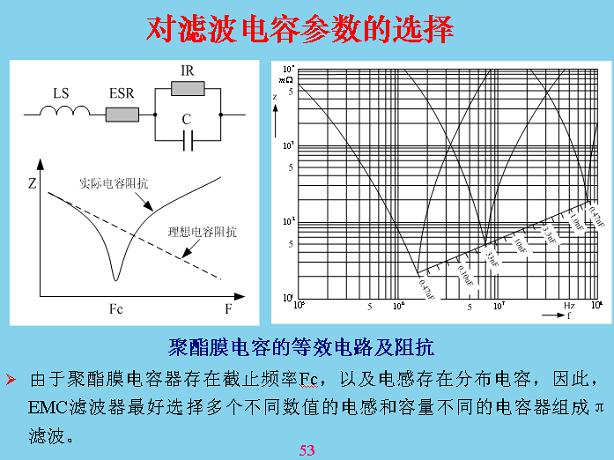 對于濾波電容,大家注意前面的EMC濾波,這個電容不是理想電容,里面有一個電感,還有漏電電阻,里面有串聯(lián)電阻,電感和電容有沒有產(chǎn)生串聯(lián)諧振?曲線是這樣一條斜線,串聯(lián)諧振相當(dāng)于把信號短路掉了,信號短路的阻礙很大,這里面有一個最佳值,然后成為感線,進行EMC電路設(shè)計的時候最好用不同的電容進行配模,這是0.4的曲線,33nF并聯(lián)就可以保證在上面不是好的,單獨一個電容后面覆蓋不到,以后有機會我講這些元器件,你們在大學(xué)里面學(xué)的是符號,對電阻電容基本是不懂的,還有電組電容這方面的問題最多,還有電容,電容來回極化的時候,速度跟不上外面的變化,會損耗相當(dāng)大,會燒壞,特別是脈壓電容,很多人認為體積越小越好,但沒有考慮在開關(guān)上容易出現(xiàn)問題。