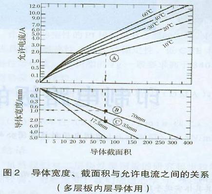 值得注意的是,當(dāng)導(dǎo)體圖形溫度上升到85℃左右時(shí),絕緣材料自身開(kāi)始發(fā)黃(圖1),電流繼續(xù)通過(guò),最后銅圖形熔斷,特別是多層板內(nèi)層圖形,周?chē)际莻鳠嵝圆畹臉?shù)脂,散熱困難,因而溫度不可避免地上升,所以特別要注意導(dǎo)體圖形線(xiàn)寬的設(shè)計(jì)。實(shí)際上在進(jìn)行PCB布線(xiàn)設(shè)計(jì)時(shí)走線(xiàn)線(xiàn)寬主要依據(jù)其發(fā)熱量和散熱環(huán)境來(lái)確定的。銅導(dǎo)體的截面積決定了導(dǎo)線(xiàn)電阻(數(shù)字電路中線(xiàn)電阻引起的信號(hào)損耗可忽略不計(jì)),銅導(dǎo)體和絕緣基材的導(dǎo)熱率影響溫升,進(jìn)而決定載流量。圖2是普通FR-4覆銅箔板銅導(dǎo)體圖形線(xiàn)寬及截面積與允許電流之間的關(guān)系圖。從圖中可以看出:導(dǎo)體圖形截面積一定,當(dāng)其允許電流值為2A,溫度上升值低于10℃時(shí),對(duì)于35Um銅箔,其線(xiàn)寬應(yīng)設(shè)計(jì)為2mm:對(duì)于70um銅箔,其線(xiàn)寬應(yīng)設(shè)計(jì)為lmm。由此得出:當(dāng)導(dǎo)體的截面積、允許電流和溫度上升值一定時(shí),可通過(guò)增加銅箔厚度或加大線(xiàn)寬值兩個(gè)方面來(lái)滿(mǎn)足走線(xiàn)的散熱要求。