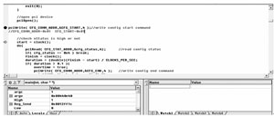 以配置開始指令的發(fā)送為例,從圖3圖4兩圖中可以看出軟硬件交互過程中的指令發(fā)送方式,在VC++中單步調試,發(fā)送一個開始指令0x01到配置命令寄存器地址0x01,通過硬件模塊的接口動作,用嵌入式存儲器SignalTapII中捕捉到LA的數據為1h,LD上的數據為1h后ConfigStart寄存器置高,配置開始。