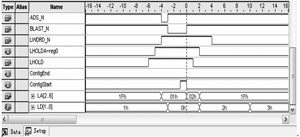 圖4中ADS_N、BLAST_N、LWORD_N、LHOLD、LHOLDA是LocalBus的接口信號,ConfigEnd和ConfigStart是分別代表配置結束和配置開始的標志寄存器,LA是接口的地址信號,用于模塊中控制寄存器的尋址,LD是接口的數據信號,用于指令數據的發(fā)送和數據的回收。