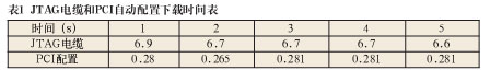 為了對比基于PCI總線的FPGA高速配置方案與基于ByteBlasterIIJTAG下載電纜的速度性能,首先使用QuartusII7.1軟件采用JTAG方式對FPGA2配置5次,計算每次下載所示時間,得到如表1中所示的數據;再使用本系統(tǒng)中基于PCI總線的配置功能對FPGA2配置5次,軟件會自行計算總的下載時間,得到如表1中所示的數據: