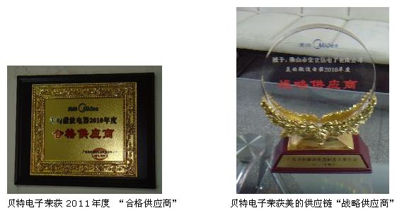 與美的合作近8年來,貝特電子有限公司憑借過硬的產(chǎn)品質(zhì)量,極強的研發(fā)能力,優(yōu)質(zhì)的售前售后服務(wù),成功獲得“合格供應(yīng)商”及“戰(zhàn)略供應(yīng)商”兩項大獎,并得到獎金3萬元。