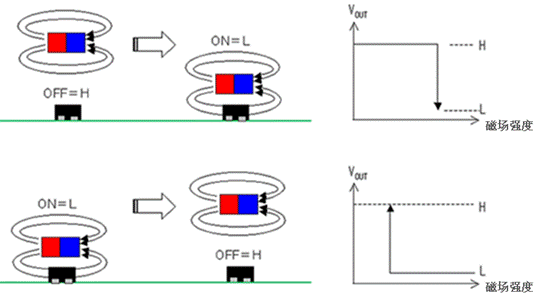 AS系列能夠通過磁鐵和傳感器之間的距離改變來檢測出磁通密度的變化,控制傳感器輸出信號(hào)的開關(guān)(高(H)<=>低(L)),如圖5所示。當(dāng)磁鐵接近傳感器,使磁場的強(qiáng)度變大,則傳感器的輸出就會(huì)由“高”變“低”,反之則由“低”變“高”。