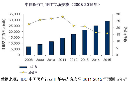 區(qū)域醫(yī)療信息平臺建設已逐步成為醫(yī)療信息化發(fā)展的引擎,醫(yī)療信息化市場繼續(xù)高速增長。根據(jù)IDC最近發(fā)布的報告《中國醫(yī)療行業(yè)IT解決方案市場2011-2015年預測與分析》,2010年醫(yī)療行業(yè)IT花費是114.1億元人民幣,較2009增長26.7%;預測到2015年IT花費市場規(guī)模達到290.2億元,2010至2015年的年復合增長率為20.5%。在各類醫(yī)療解決方案中,區(qū)域醫(yī)療信息平臺的增長最快,2010-2015年復合增長率達24.7%。