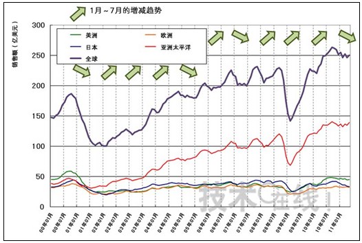 2011年1月份,全球半導(dǎo)體銷售額比上年同月增長14%,實現(xiàn)了開門紅。此后,銷售額與上月相比時增時減,而從稍長一點的時間區(qū)間來看,銷售額自2010年10月達到頂峰以后一直在減少。從2001年以后每年上半年的增減趨勢來看,增長的年份居多。這意味著2011年出現(xiàn)了停滯和衰退。