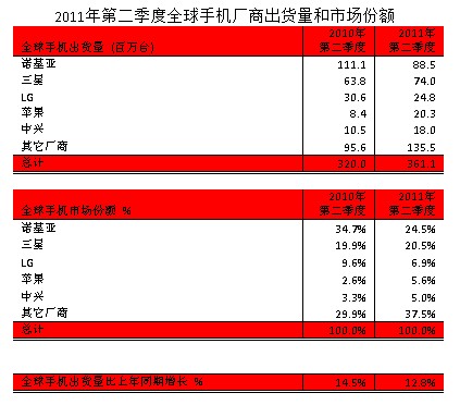 日前,據(jù)Strategy Analytics最新研究顯示,2011年二季度全球手機(jī)出貨量比去年同期增長13%,達(dá)到3.611億臺(tái)。諾基亞出現(xiàn)自1999年以來最大下滑,而蘋果已經(jīng)接近排名第三的LG。