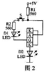 可控硅檢測電路如圖2所示,先用萬用表檢測出被測可控硅的A、G、K極,再將被測可控硅的A、G、K三個引腳插入對應(yīng)的插孔中,接通電源,不按按鈕開關(guān)S時,發(fā)光二極管D2不發(fā)光,按一下按鈕開關(guān)S時,若發(fā)光二極管D2能持續(xù)發(fā)光,則被測可控硅是好的。