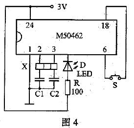 陶瓷振子檢測電路如圖4所示,外接元件455kHz或500kHz陶瓷振子X,C1、c2與集成電路M50462的2、3腳內(nèi)部電路組成455kHz或500kHz的振蕩電路,將被測的455kHz或500kHz陶瓷振子插入插孔中,接通電源,按住按鈕開關(guān)S時,發(fā)光二極管能不停地閃爍發(fā)光,則說明被測陶瓷振子是好的。