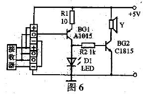 紅外線遙控接收器和紅外線遙控發(fā)射器的檢測電路如圖6所示。圖中Y是直徑為1cm,高為1cm左右的圓柱形小體積蜂鳴器,插孔的標(biāo)號“+”、“-”表示遙控接收器的電源端,“o”表示遙控接收器的信號輸出端。若檢測一體化的三端紅外線遙控接收器,將被測遙控接收器的3只引腳插入對應(yīng)的插孔中,接通電源,用一只好的紅外線遙控發(fā)射器對著遙控接收器,按住遙控發(fā)射器的任意按鍵時,若D1能閃爍發(fā)光,同時蜂鳴器Y發(fā)聲,則被測紅外線遙控接收器是好的。若要檢測紅外線遙控發(fā)射器的好壞,要將一只好的紅外線遙控接收器插入插座中,按下被測紅外線發(fā)射器的任何按鍵時,發(fā)光二極管D1都能閃爍發(fā)光,同時蜂鳴器發(fā)聲,則被測紅外線遙控發(fā)射器是好的。
