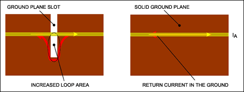 返回電流通路須盡可能靠近主電流通道,將輻射磁場(chǎng)降至最小。這種布局有助于減小電流環(huán)路面積。返回電流的理想低阻通路通常是引線下方的接地區(qū)域—將環(huán)路面積有效限制在電介質(zhì)厚度乘以引線長度的區(qū)域。但是,如果接地區(qū)域被分割開,則會(huì)增大環(huán)路面積(圖3)。對(duì)于穿過分割區(qū)域的引線,返回電流將被強(qiáng)制通過高阻通路,大大提高了電流環(huán)路面積。這種布局還使電路引線更容易受互感的影響。