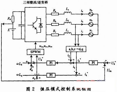 在對機車蓄電池充電時,為了快速充電同時延長電池的使用壽命,將充電與放電過程分成不同的階段,可以視具體情況分階段選擇恒流或者恒壓模式充放電。恒壓充放電模式采用電壓定向控制模式,控制框圖如圖2所示??刂撇呗圆捎秒p閉環(huán)結(jié)構(gòu),外環(huán)控制直流電壓,內(nèi)環(huán)控制電流。電流內(nèi)環(huán)作用是提高系統(tǒng)的動態(tài)性能和實現(xiàn)限流保護,電壓外環(huán)的作用是保證直流側(cè)電壓的穩(wěn)定性。直流輸出電壓給定信號和實際直流電壓Vdc比較后的誤差信號送入P1調(diào)節(jié)器,PI調(diào)節(jié)器的輸出即為主電路交流輸入?yún)⒖茧娏鞯姆?,比較得到電流誤差后,對電流誤差進(jìn)行PI調(diào)節(jié),用以減緩電流在動態(tài)過程中的突變。然后再與輸入電壓的空間矢量進(jìn)行比較控制,最后通過SPWM調(diào)制算法即可生成相應(yīng)6路驅(qū)動脈沖控制三相整流橋IGBT的通斷,間接地控制網(wǎng)側(cè)電流,實現(xiàn)網(wǎng)側(cè)功率因素的調(diào)節(jié)。
