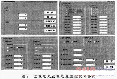 為了驗證課題所設(shè)計的蓄電池充放電裝置的功能,設(shè)計了檢測與監(jiān)控系統(tǒng)。軟件的部分界面如圖7所示。