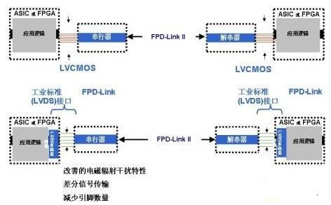 一旦接收器PLL鎖定在發(fā)射器的頻率下,即可由LOCK輸出標志引腳顯示這一狀態(tài),確保接收器輸出的數(shù)據(jù)完整性。DS90UR907/8芯片組具有DS90UR905/6芯片組的一切特性,兩耳區(qū)別在于輸入輸出不再是發(fā)送LVCMOS信號的并行總線,而是遵照開放的工業(yè)標準"FPD-Link"。很多現(xiàn)代化的圖像控制器、顯示定時控制器、ASIC和FPGA都支持這種"一級串行化"技術,它采用適合18bpp的3個數(shù)據(jù)通道,或者適合24bpp的4個數(shù)據(jù)通道,每一個都有一路并行時鐘通道。電信號的發(fā)送遵循開放的ANSI/TIA/EIA-644A標準,該標準又稱作"LVDS"(低壓差分信號傳輸)。使用該接口技術代替常規(guī)LVCMOS的優(yōu)勢在于:采用差分信號可降低電磁干擾,并減少組件的引腳數(shù)量,如圖3所示。