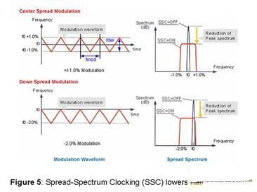 解串器通過一塊集成可配置的擴頻時鐘(SSC)生成器得到增強。在接收器輸出總線端,這會導致輸出時鐘頻率和數(shù)據(jù)頻譜隨著時間推移而以幾十KHz的低調(diào)制率產(chǎn)生輕微變化。如圖5所示,頻率變化可以發(fā)生在名義像素時鐘中心頻率附近("中心擴頻調(diào)制"),或朝向更低的頻率("向下擴頻調(diào)制")。頻譜擴展百分比可高達±2%。擴頻時鐘將峰值能量分散在更寬的頻譜范圍內(nèi),從而大大降低了電磁干擾噪聲水平,而不是在同一時間點上、以恒定頻率來轉換所有輸出,此時的輻射噪聲集中在一個窄頻段內(nèi),所有輸出數(shù)據(jù)都與輸出時鐘同步,這使得數(shù)據(jù)和時鐘得到有效擴展。特別是DS90UR906接收器輸出具有低壓(LV)CMOS接口選項,可以大大降低電磁輻射。