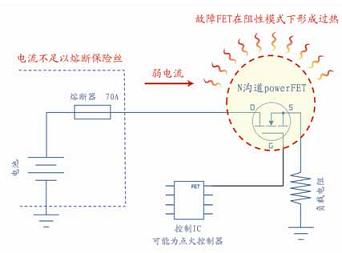圖1 說明了一個(gè)出現(xiàn)故障的powerFET可能并不會產(chǎn)生一個(gè)完全硬短路的過流情況,而是產(chǎn)生阻性短路,因此通過I2R發(fā)熱造成不安全的溫度。在這種情況下,所形成的電流可能并沒有高到使一個(gè)標(biāo)準(zhǔn)保險(xiǎn)絲熔斷并阻止印制電路板上的熱失控。