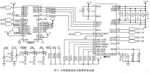 CS8416具有多個可選的音頻輸入接口。該系統(tǒng)設(shè)計是將CS8416的引腳RXSEL1接高電平,引腳RXSEL0接地,選擇引腳RXP3作為音頻數(shù)據(jù)輸入接口。音頻時鐘重建通過片上的鎖相環(huán)(PLL)實現(xiàn),該鎖相環(huán)不需要過多地改變外部元件即可在很大范圍內(nèi)鎖定輸入音頻數(shù)據(jù)中的取樣頻率Fs。但外接電阻電容組成的濾波電路也會影響其頻率變化范圍。為了獲得一個低抖動的重建時鐘,外接濾波器的電阻電容值如圖2所示。