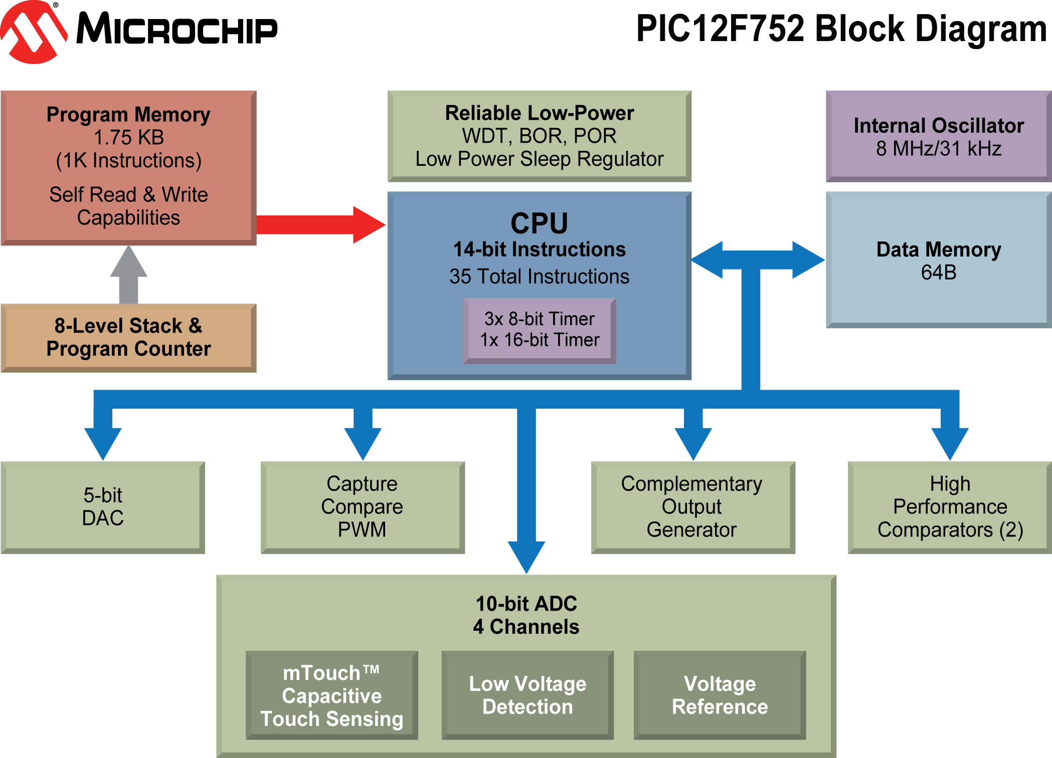 工程師們始終面臨著在降低系統(tǒng)成本同時提高系統(tǒng)性能和效率的挑戰(zhàn),特別是新近的LED照明和電池充電應用。憑借集成的COG、高性能比較器、可直接驅(qū)動MOSFET的50 mA輸出等豐富的片上通用和專用外設,PIC12F(HV)752 MCU能夠滿足這些需求。PIC12HV752 MCU是該系列中的高電壓型器件,集成了并聯(lián)穩(wěn)壓器,使器件可在2V至未指定用戶定義最大電壓下工作,其工作電流小于2 mA。這一高電壓型器件是采用高電壓電源軌的成本敏感型應用的理想選擇。此外,4通道10位ADC可用來實現(xiàn)各種傳感器和mTouch™ 觸摸傳感應用,包括電容式觸摸。