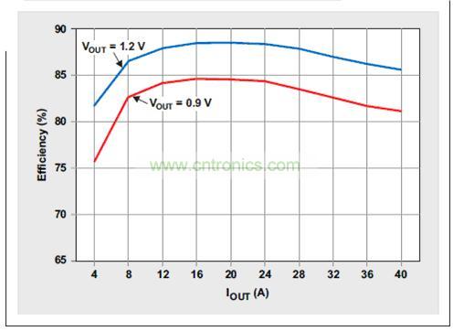 由于每個(gè)相位的功率級(jí)電流更低,多相實(shí)現(xiàn)的輸出濾波器要求也隨之降低。對(duì)于一款40-A 二相解決方案來說,向每個(gè)電感提供的平均電流僅為20A。相比40-A 單相方法,由于平均電流和飽和電流更低,電感和電感器體積都大大減小。