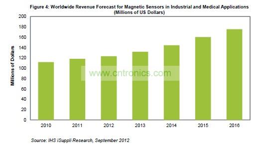 2011年工業(yè)與醫(yī)療磁性傳感器營(yíng)業(yè)收入為1.182億美元,而2010年是1.119億美元。盡管該領(lǐng)域的營(yíng)業(yè)收入少于汽車和無線-消費(fèi)等其它磁性傳感器領(lǐng)域,但將促進(jìn)未來幾年傳感器市場(chǎng)持續(xù)擴(kuò)張。到2016年,這個(gè)磁性傳感器領(lǐng)域的營(yíng)業(yè)收入將增至1.755億美元,如圖所示,五年復(fù)合年度增長(zhǎng)率為8%。